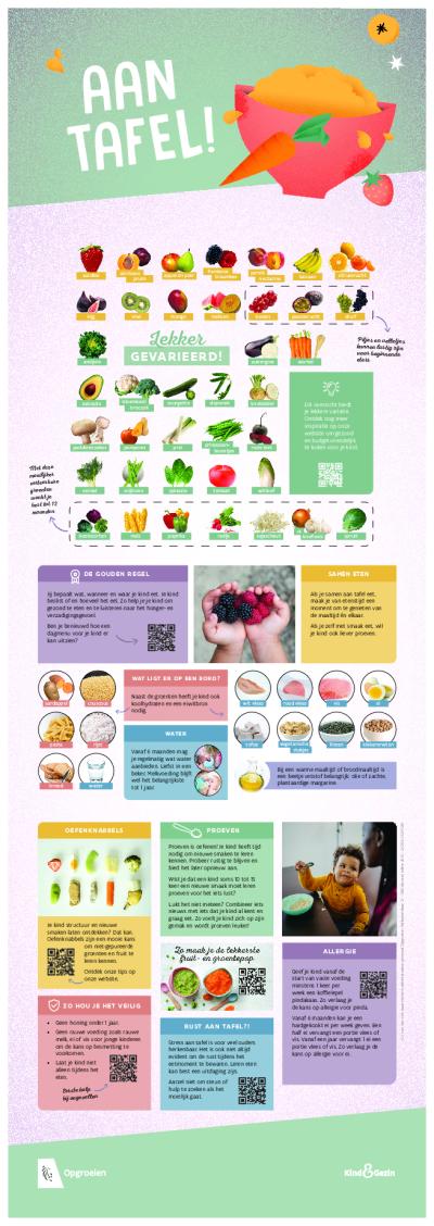 De wijzer 'Aan tafel' biedt een overzicht van lekker variatie. De wijzer laat zien hoe je de start van vaste voeding kan aanpakken, met aandacht voor het tempo van elk kind.