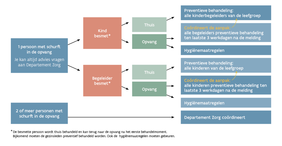 - Departement Zorg coördineert de maatregelen bij 2 of meer gevallen van schurft in 6 weken tijd in de kinderopvang om de verspreiding van de ziekte te voorkomen. .
