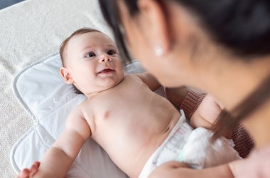 Leg je baby op de buik of zij tijdens het aan- en uitkleden. Help je baby rollen van zijn rug naar zijn buik met ondersteuning van het hoofd en de romp.