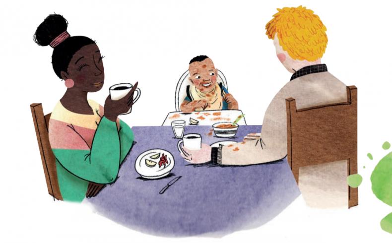 Indra: “Sommige ouders panikeren als hun kindje kokhalst. Kokhalzen en stikken worden vaak met elkaar verward. Kokhalzen is een natuurlijke reflex die de voeding terug vooraan in de mond brengt indien het stukje bijvoorbeeld te groot was om in één keer door te slikken. Bij kokhalzen maakt het kind geluid en zit de voeding niet vast in de luchtpijp. Stikken daarentegen is mogelijks een levensbedreigende situatie. Hierbij maakt het kind geen geluid meer, zit de voeding geblokkeerd in de luchtpijp en moet er ingegrepen worden. Als je kind goed wakker is en flink rechtop zit, is kokhalzen geen reden om vaste voeding uit te stellen. Vergelijk het met leren fietsen: ook dan wankelt of valt je kind weleens. Leren eten is ontdekken hoelang je moet sabbelen vooraleer je iets kan doorslikken. Voel je je wat onzeker? Start de vaste voeding dan op een moment dat je er niet alleen voor staat, bijvoorbeeld als je partner ook thuis is of als oma en opa langskomen.